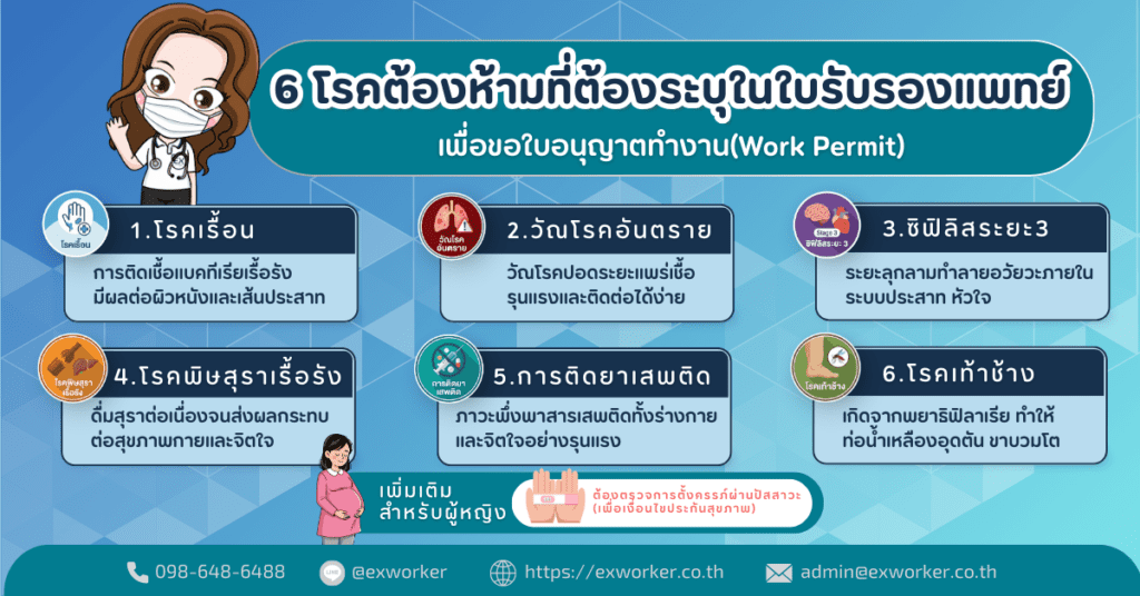 สรุปจบ! ใบรับรองแพทย์ขอ Work Permit ต้องมีอะไรบ้าง? จะยื่นขอใบอนุญาตทำงานให้ผ่านฉลุย ใบรับรองแพทย์ต้องเคลียร์! มาดูเช็กลิสต์สำคัญกันครับ: 6 โรคต้องห้าม (ต้องระบุว่าปกติ/ไม่พบ): โรคเรื้อน, วัณโรคอันตราย, ซิฟิลิสระยะ 3, พิษสุราเรื้อรัง, ติดยาเสพติด, โรคเท้าช้าง สำหรับผู้หญิง: ต้องตรวจตั้งครรภ์ (เงื่อนไขประกันสุขภาพ) Key Message ที่ต้องมีในเอกสาร: “ไม่พบโรคต้องห้ามทั้ง 6 โรค” (สำคัญมาก!)เช็กครบ จบไว ไม่โดนตีกลับแน่นอน! _____________________________________Exworker ใบอนุญาตเลขที่ นจ.0122/2561บริการงานต่างด้าวครบวงจรบริการขึ้นทะเบียนแรงงานต่างด้าว ตามมติ ครม. นำเข้าแรงงาน MOU พม่า ลาว กัมพูชาบริการต่ออายุเอกสารแรงงานบริการแจ้งเปลี่ยนย้ายนายจ้างบริการแจ้งออกแรงงานต่างด้าวควมคุมดูแลและอัพเดทงานทุกขั้นตอนมีระบบ online เก็บฐานข้อมูลแรงงานติดต่อรับคำปรึกษาได้ที่ : 098-648-6488: admin@exworker.co.thLine@ : @exworker Web: Exworker.co.thFB: exworker.agencyIG: exworker.agency#mou #แรงงานต่างด้าว #ต่างด้าว #ทำพาสปอร์ต #บัตรmou #ต่อworkpermit #ทำบัตรชมพูใหม่ #งานต่างด้าว #ต่อเอกสารแรงงานต่างด้าว #ต่อเอกสาร #แรงงานพม่า #แรงงานลาว #แรงงานกัมพูชา #แรงงานเวียดนาม #mou #ขึ้นทะเบียนแรงงาน #เปลี่ยนนายจ้าง #exworker #CI